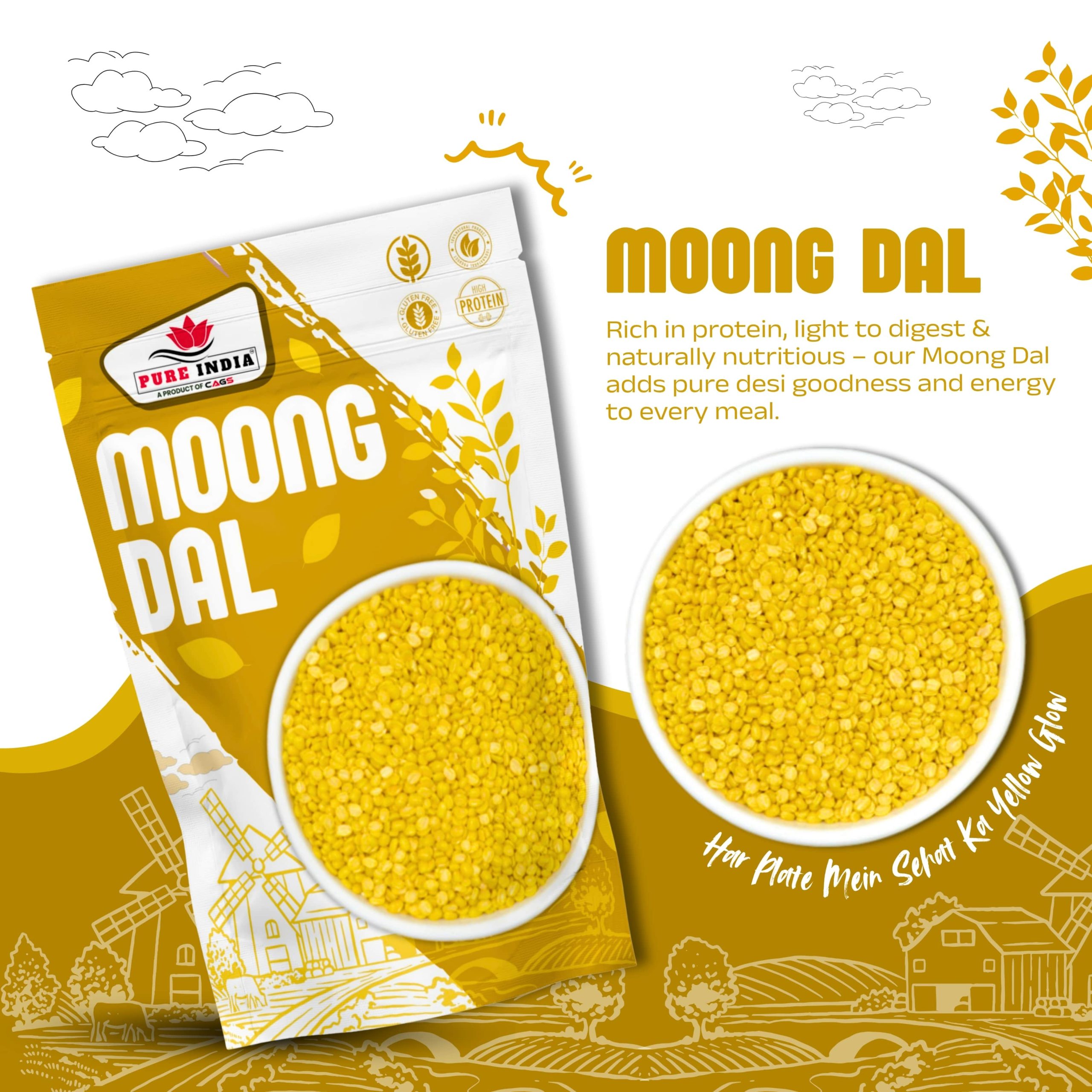 Moong Dal, also known as Split Yellow Gram, is one of the most nutritious and easily digestible pulses. Made from dehusked moong beans, it has a mild flavor, soft texture, and cooks quickly, making it a staple in Indian kitchens.