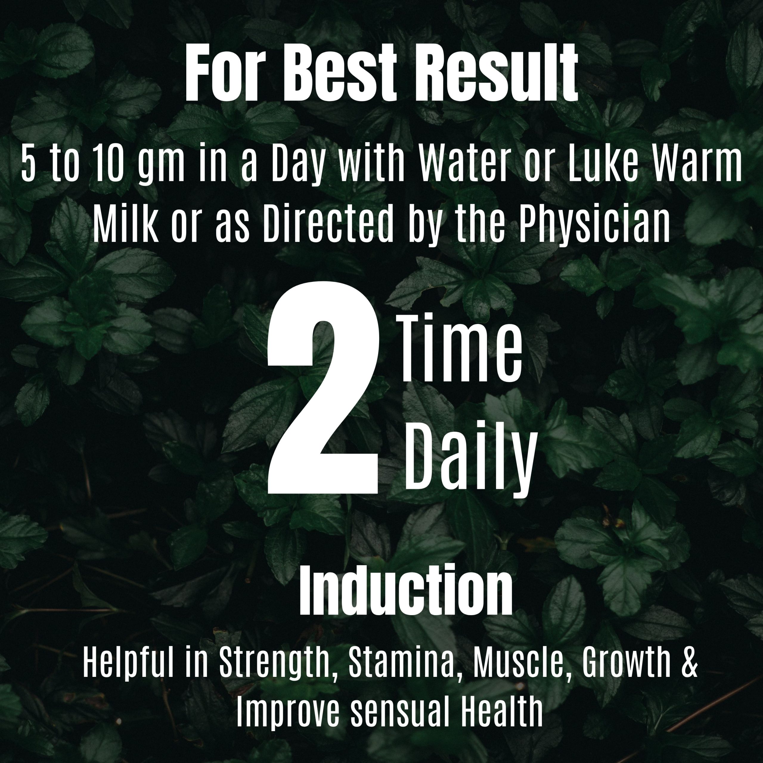 Dosage : 5 to 10 gm two times a day with water or luke warm milk or as directed by the physician. Indication : Helpful in strength, stamina, muscle growth & improve Sensual Health.